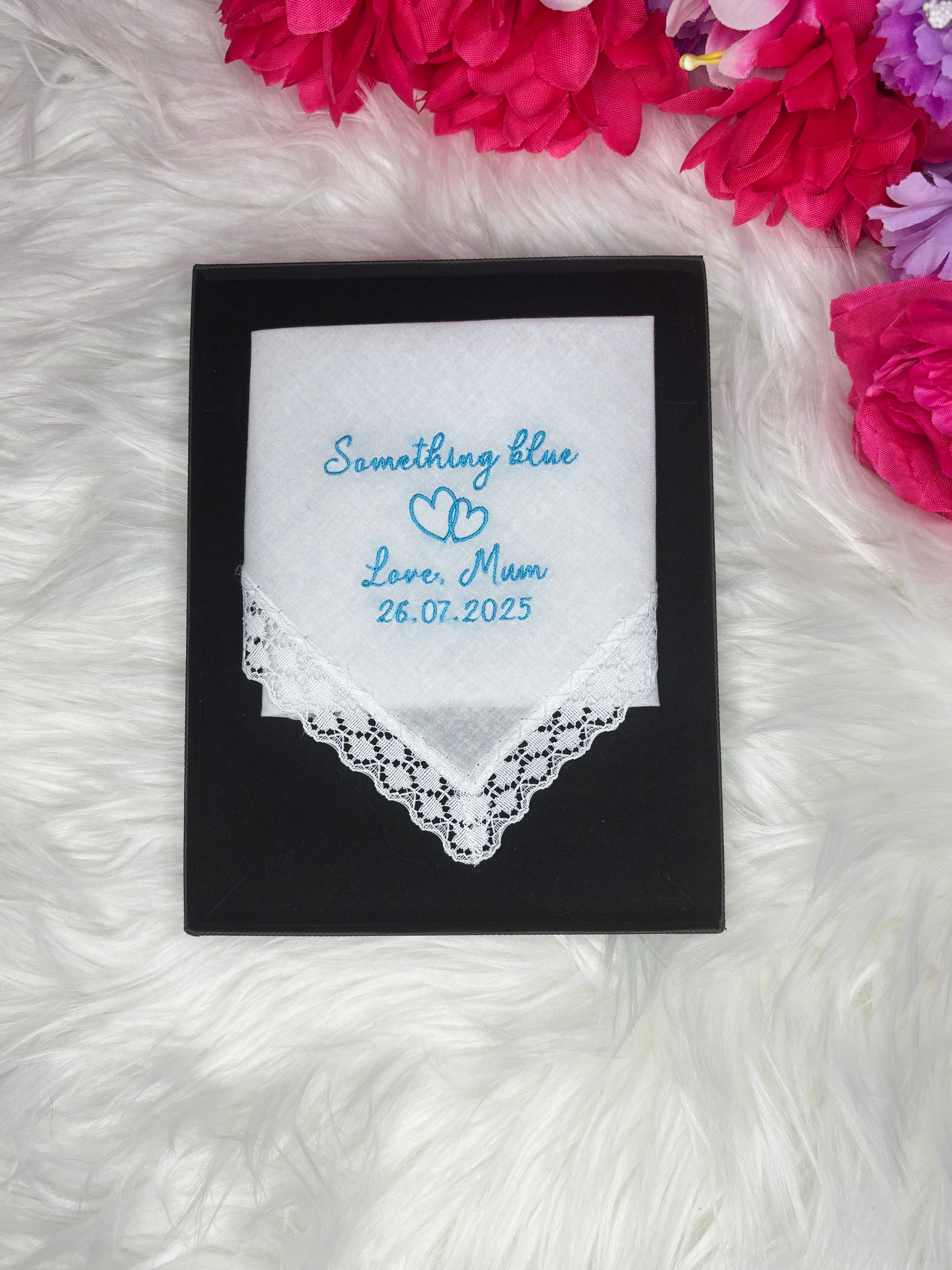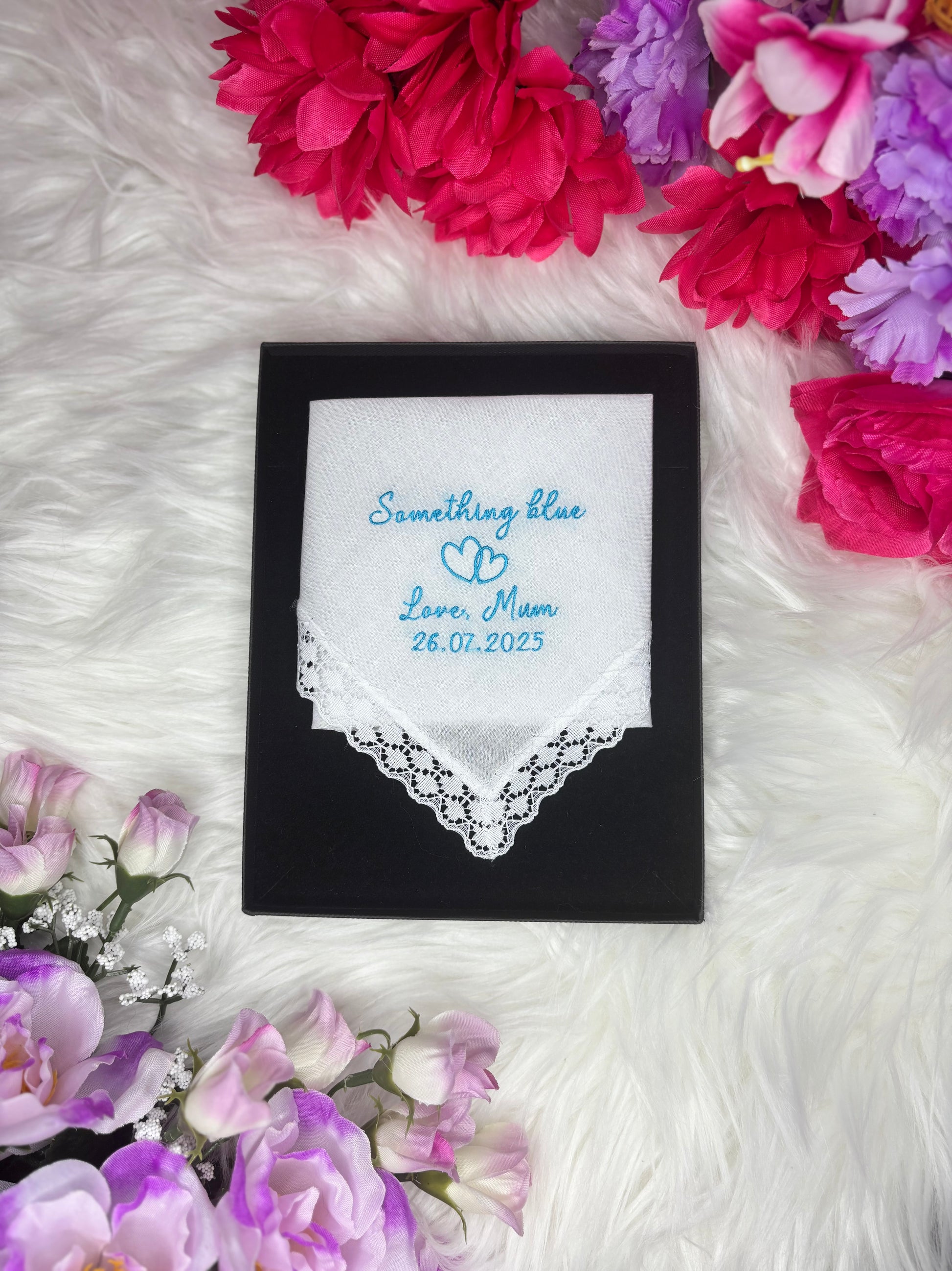 Bride to be - Something Blue embroidered personalised wedding handkerchief gift